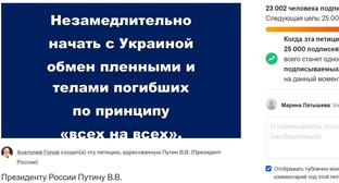 Более 23 тысяч подписей собрала петиция к Путину с призывом обменяться с Украиной пленными и телами погибших. Инициативу поддержал режиссер Александр Сокуров и другие деятели искусства, а также депутаты и правозащитники. kavkaz-uzel.ru »