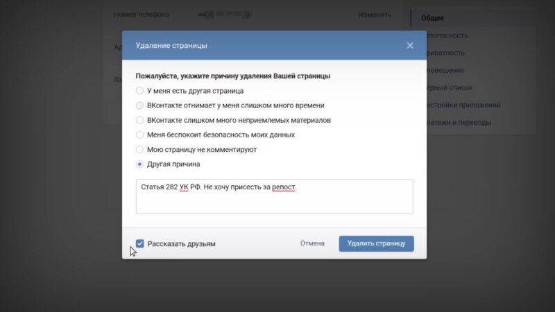 Возможно ли раз и навсегда обезопасить себя от потенциальных претензий российского правосудия к своим постам и репостам, удалив аккаунт в соцсети "ВКонтакте"? Оказалось, это непросто, но вполне реально. Смотрите, как это можно сделать.